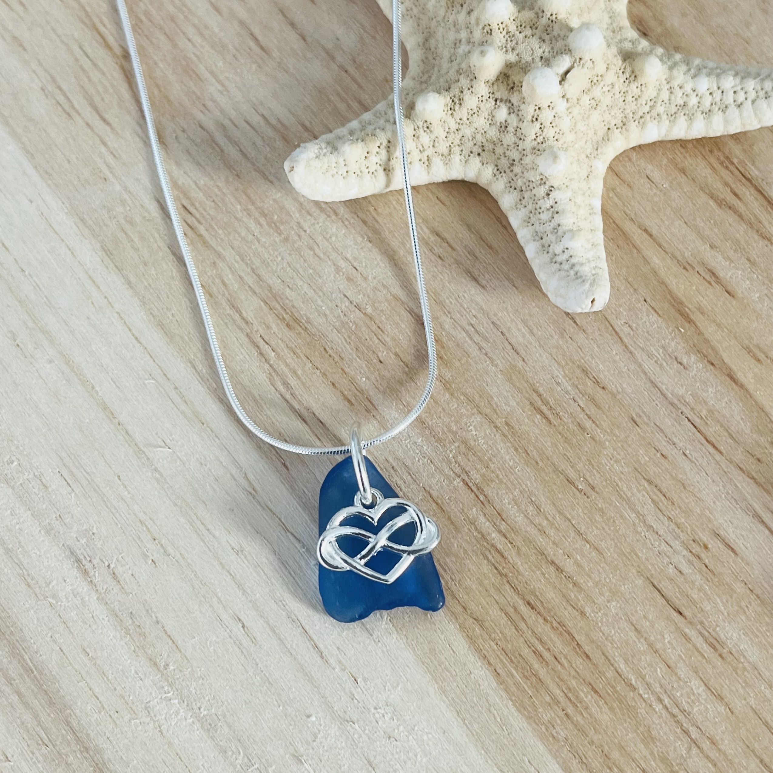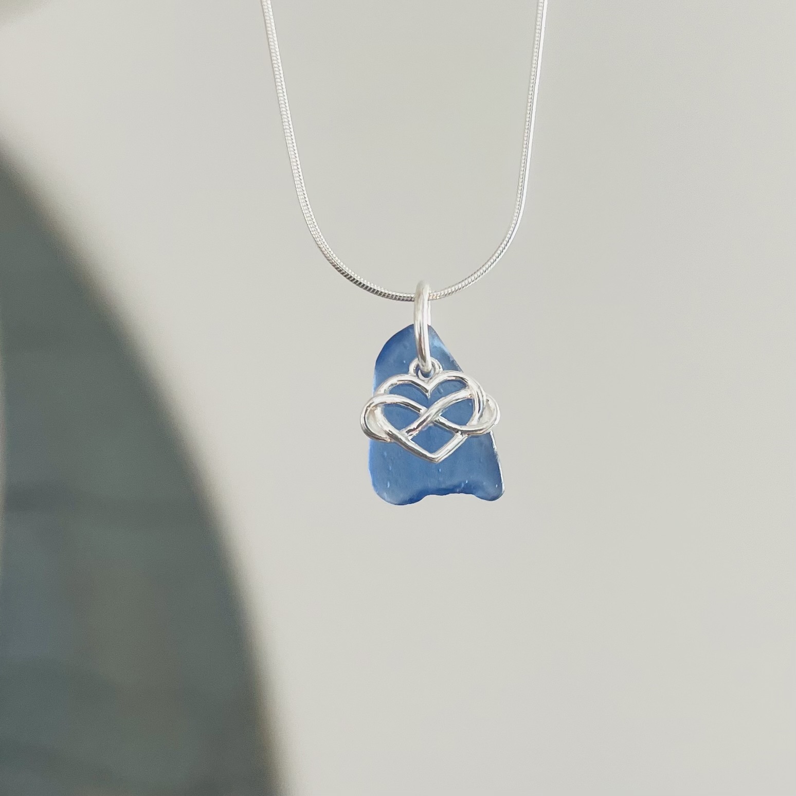This elegant necklace features a smooth, frosted blue sea glass pendant, handpicked from the shore for its vibrant color and natural beauty. Set on an 18-inch sterling silver snake chain with an adjustable option to 16 inches, it ensures a perfect fit for any style. The pendant is adorned with a sterling silver infinity heart charm, symbolising eternal love and connection, blending beautifully with the ocean-inspired design. The deep blue sea glass captures the essence of the sea, making this lightweight and versatile necklace an ideal accessory for both casual and formal occasions. Perfect for those seeking a timeless touch of the ocean.